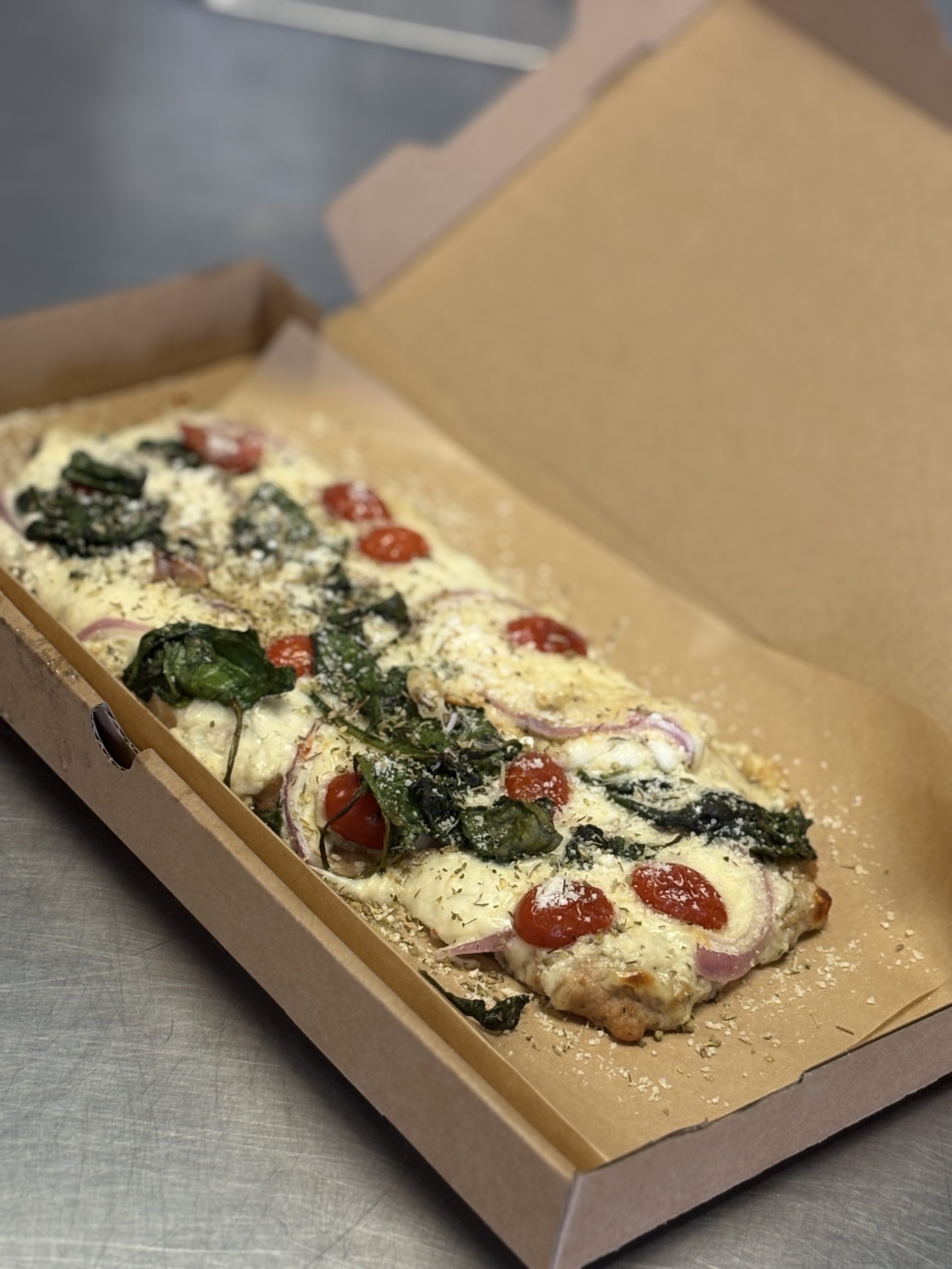Florentine Pizza ground chicken crust, cottage cheese aflredo base, mozzarella cheese, spinach and tomato