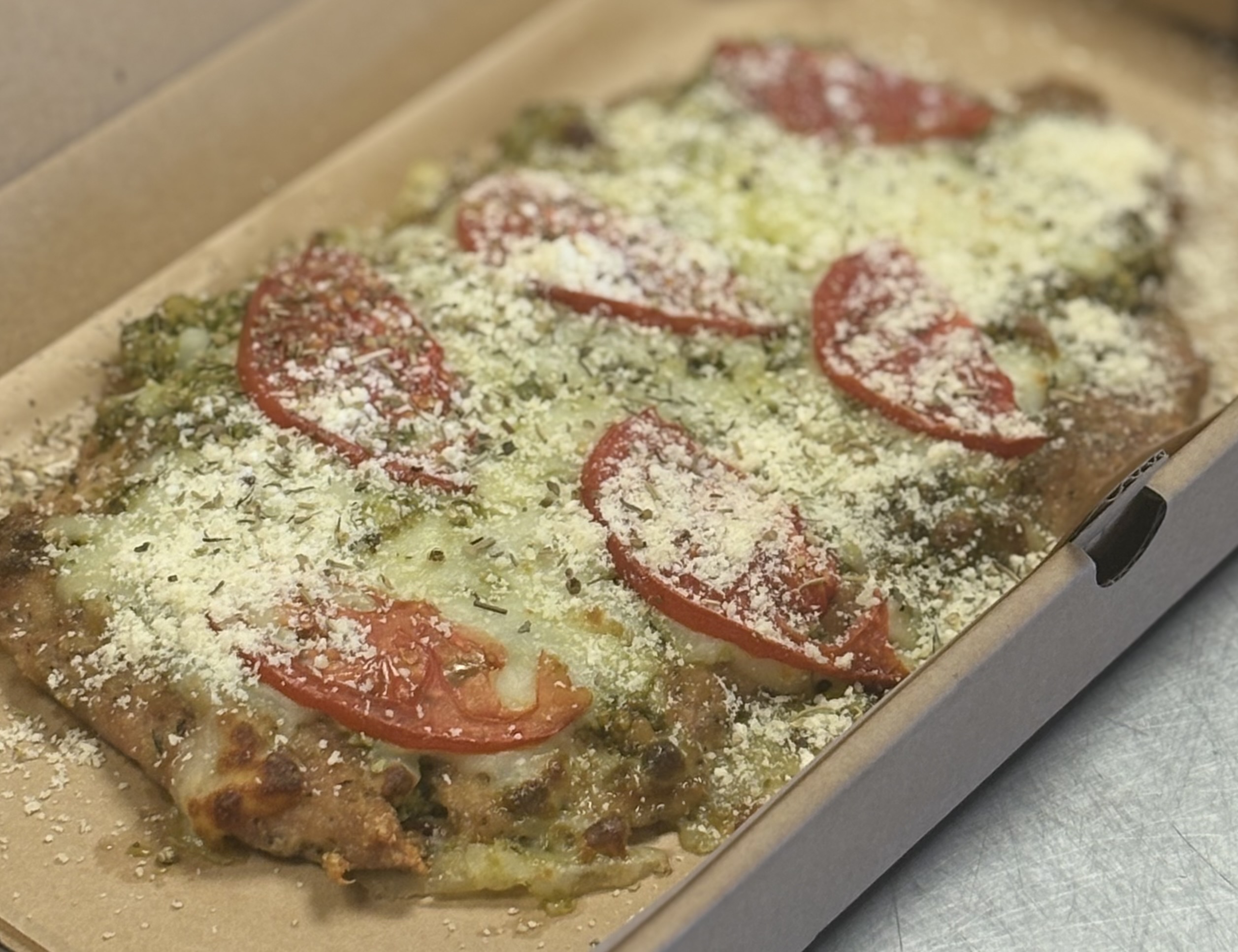 Ground Chicken Crust Pesto Tomato Pizza with mozzarella and fresh parm quantity